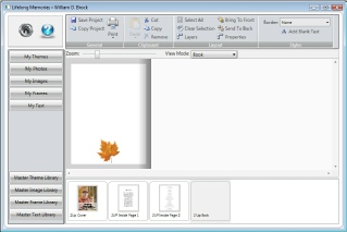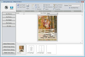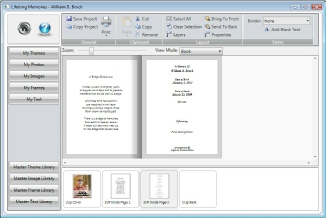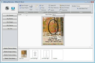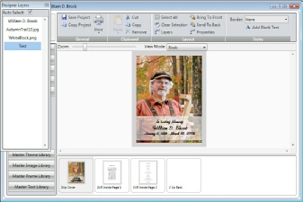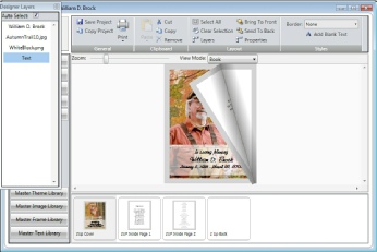 Lifelong Publisher will automatically bring in the inputted data you placed in the data entry screen. Just like the cover you have the ability to double click any text item and do an edit on it. You also have available Text libraries such as poems and prayers that you can also use. If you would like to use a poem other than the one included in the theme you can Remove it and replace it with a different one. To bring in a new text item click on the Master Text Library button, locate a new item and drag it into your project. If you would like to put an obituary in the text box you will first have to copy the obituary text to the clipboard. Your word processing program should allow you to do that.