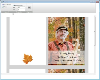 Your Lifelong Publisher program has preset print margins set and should work well in most cases. But from time to time you may have to set the margins for your printer. It is suggested that the first time you print a product that you first print to a plain piece of paper and overlay the print with the perforated sheet that was supplied with your Service Folders. In the case of the 2up Medium service folders this sheet size is a letter size sheet. To print your folders simply select the Print option in the top menu bar. You will than be shown a print dialog for your printer. You can check the properties to make sure the print is letter size and uses heavy paper. Then select OK to send the print to the printer. If the print margins need to be set for your printer simply click on the image in this print dialog screen. You can change the margin numbers for both the top and bottom print by typing new numbers to move the print in the direction it needs to be moved to for alignment. Otherwise you can also drag the image and move it. Once you have proper alignment you will select the Save Margins option to save the margins for future printing.