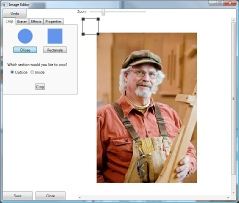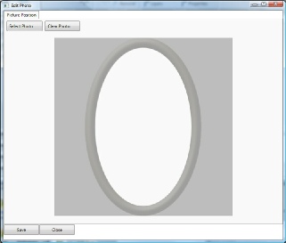 You now have the ability to move the photo and resize it to fit into your frame. To move the photo place your mouse pointer on top of the photo, hold down your left mouse button and drag the photo into position. To resize the photo place your mouse pointer on top of the corner and drag it until the desired size is reached. Repeat this process until you have the photo size and location the way you want it. Once accomplished select the Save button. Then select the Close button.