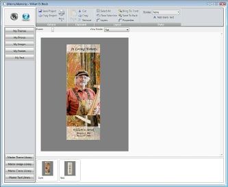 The next step with the creation of your Bookmark is to add a photo of the deceased. You have several options to accomplish this. First, your theme will already include a color matched frame for the deceased. If this frame is acceptable all you will need to do is place the photo into the supplied frame. Otherwise you can select a different frame to use or not use a frame at all. For this tutorial we will show you how to accomplish several approaches.