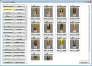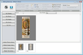 This is the main product creation screen for the 3 x 9 single bookmark product. You will notice several buttons on the left side of this screen. There are two sets of buttons. The My library buttons and the Master library buttons. The My buttons will display to you the libraries you create while the Master buttons will display to you all the items available in the program. In some cases you will need to add items from the Master libraries to your libraries. This is true for Themes selections. To accomplish this select the Master Theme Library button.