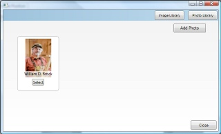 This screen will show you the photos of the deceased you uploaded when you were working on the data entry screen. You can use one of the photos or add an additional one if you wish. Also, it is possible to add images other than photos into frames if you would like. This would be accomplished by selecting the Image Library button and selecting an image from your library. For the purpose of this tutorial you can click on the Select button located under the photo you would like to place into the frame.