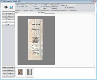 Lifelong Publisher will automatically bring in the inputted data you placed in the data entry screen. Just like the cover you have the ability to double click any text item and do an edit on it. You also have available Text libraries such as poems and prayers that you can also use. If you would like to use a poem other than the one included in the theme you can Remove it and replace it with a different one. To bring in a new text item click on the Master Text Library button, locate a new item and drag it into your project. If you would like to put an obituary in the text box you will first have to copy the obituary text to the clipboard. Your word processing program should allow you to do that.