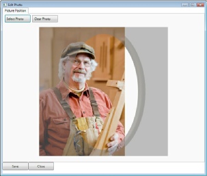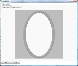 You now have the ability to move the photo and resize it to fit into your frame. To move the photo place your mouse pointer on top of the photo, hold down your left mouse button and drag the photo into position. To resize the photo place your mouse pointer on top of the corner and drag it until the desired size is reached. Repeat this process until you have the photo size and location the way you want it. Once accomplished select the Save button. Then select the Close button.