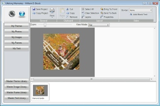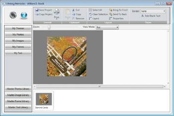 You should see the photos you uploaded during the data entry screens. If not or if you need additional photos you can select the Add Photo button and add more photos. If the photo is there you want to use simply place your mouse point on top of the photo and hold your left mouse button down. Then drag the photo and place it onto your project. You can bring more then one photo into your project if you would like. When completed close the My Photos Library screen.