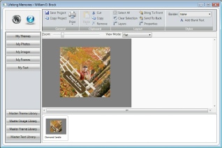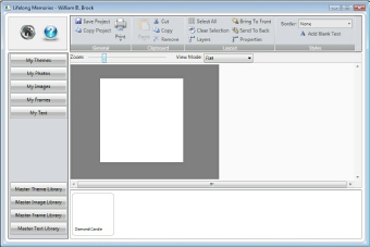 This is the main project creation screen for the Diamond candle. You will notice that Lifelong Publisher will automatically place name and date information into the project. This information was used from your data entry screen. With Lifelong Publisher you have the ability to make any changes that you would like with your project. Each element can be sized, move or rotated or even deleted. To edit any text items contained within your project you can simply place your mouse pointer on top of the text and double click your left mouse button. For this tutorial double click on the name information.