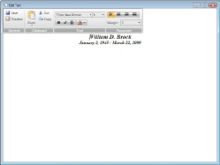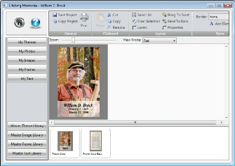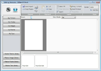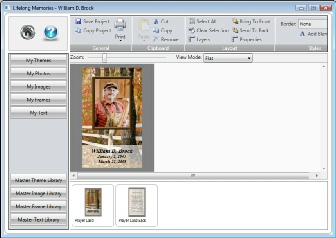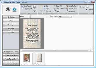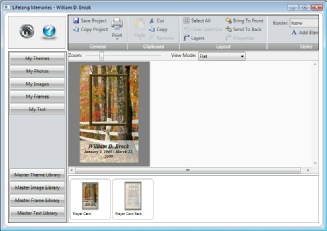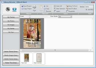 Lifelong Publisher will automatically bring in the inputted data you placed in the data entry screen. Just like the cover you have the ability to double click any text item and do an edit on it. You also have available Text libraries such as poems and prayers that you can also use. If you would like to use a poem other than the one included in the theme you can Remove it and replace it with a different one. To bring in a new text item click on the Master Text Library button, locate a new item and drag it into your project.