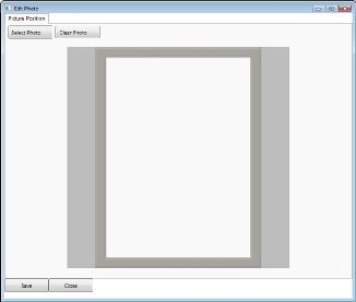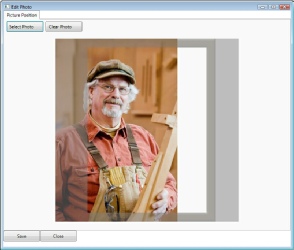You now have the ability to move the photo and resize it to fit into your frame. To move the photo place your mouse pointer on top of the photo, hold down your left mouse button and drag the photo into position. To resize the photo place your mouse pointer on top of the corner and drag it until the desired size is reached. Repeat this process until you have the photo size and location the way you want it. Once accomplished select the Save button. Then select the Close button.