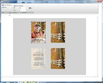 Your Lifelong Publisher program has preset print margins set and should work well in most cases. But from time to time you may have to set the margins for your printer. It is suggested that the first time you print a product that you first print to a plain piece of paper and overlay the print with the perforated sheet that was supplied with your Small Remembrance candle. To print your candle simply select the Print option in the top menu bar. You will than be shown a print dialog for your printer. You can check the properties to make sure the print is Landscape and uses heavy paper. Then select OK to send the print to the printer. If the print margins need to be set for your printer Simply click on the image in this print dialog screen. You can change the margin numbers by typing new numbers to move the print in the direction it needs to be moved to for alignment. Otherwise you can also drag the image and move it. Once you have proper alignment you will select the Save Margins option to save the margins for future printing.