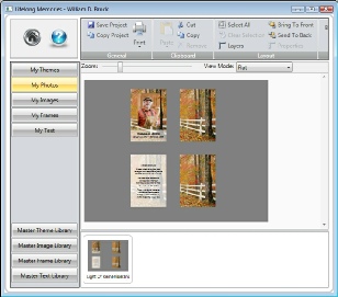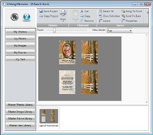 You should see the photos you uploaded during the data entry screens. If not or if you need additional photos you can select the Add Photo button and add more photos. If the photo is there you want to use simply place your mouse point on top of the photo and hold your left mouse button down. Then drag the photo and place it onto your project. You can bring more then one photo into your project if you would like. When completed close the My Photos Library screen.