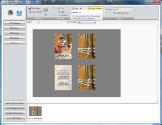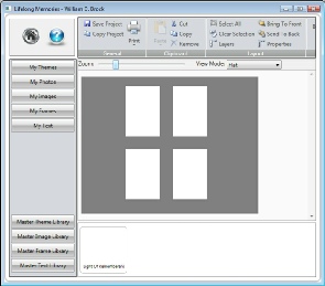 The Master Frame library provides you with two options. First, if you would like to copy a frame from the Master library to your library than you can select the Add button located under the desired frame. If you would like to simply use the frame directly from the Master library than you can select it and place it onto your project. To do this, locate the desired frame and place your mouse pointer on top of the frame. Hold down your left mouse button and drag the frame. The library screen should than disappear and you can drag and drop the frame onto your project. Then close the Master Frame library screen. You should now see the selected frame in your project. Click on the frame and drag it to the desired location. You can also resize it as previously described. To place a photo into your new frame, follow the previous steps of double clicking on the frame and selecting a photo.