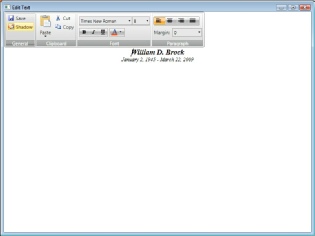 This is the main project creation screen for the Small Remembrance candle. You will notice that Lifelong Publisher will automatically place name and date information into the project. This information was used from your data entry screen. With Lifelong Publisher you have the ability to make any changes that you would like with your project. Each element can be sized, move or rotated or even deleted. To edit any text items contained within your project you can simply place your mouse pointer on top of the text and double click your left mouse button. For this tutorial double click on the name information.