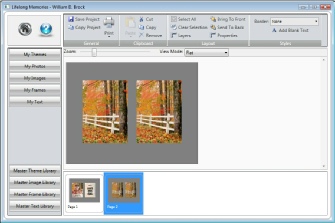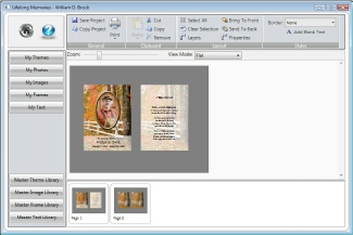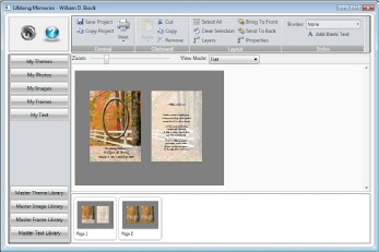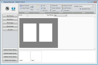 The Master Frame library provides you with two options. First, if you would like to copy a frame from the Master library to your library than you can select the Add button located under the desired frame. If you would like to simply use the frame directly from the Master library than you can select it and place it onto your project. To do this, locate the desired frame and place your mouse pointer on top of the frame. Hold down your left mouse button and drag the frame. The library screen should than disappear and you can drag and drop the frame onto your project. Then close the Master Frame library screen. You should now see the selected frame in your project. Click on the frame and drag it to the desired location. You can also resize it as previously described. To place a photo into your new frame, follow the previous steps of double clicking on the frame and selecting a photo.