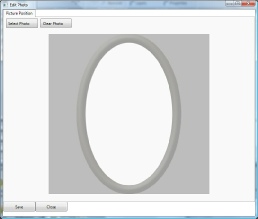 You now have the ability to move the photo and resize it to fit into your frame. To move the photo place your mouse pointer on top of the photo, hold down your left mouse button and drag the photo into position. To resize the photo place your mouse pointer on top of the corner and drag it until the desired size is reached. Repeat this process until you have the photo size and location the way you want it. Once accomplished select the Save button. Then select the Close button.