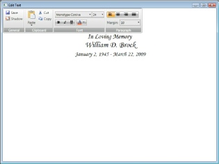 This is the main project creation screen for the Square Series or Large Remembrance candle. You will notice that Lifelong Publisher will automatically place name and date information into the project. This information was used from your data entry screen. With Lifelong Publisher you have the ability to make any changes that you would like with your project. Each element can be sized, move or rotated or even deleted. To edit any text items contained within your project you can simply place your mouse pointer on top of the text and double click your left mouse button. For this tutorial double click on the name information.