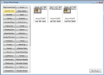 You will notice three buttons at the bottom of each theme. You will see Load, Edit and Delete. The Load button will load the selected theme for your project. The Edit button will let you make changes to the actual theme for future use. For example if you wanted to change the font size and style for your themes to use you could do an edit, make the changes and any future use of the theme would use your changes. The Delete button would simply remove the theme from your library.
