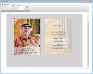 Your Lifelong Publisher program has preset print margins set and should work well in most cases. But from time to time you may have to set the margins for your printer. It is suggested that the first time you print a product that you first print to a plain piece of paper and overlay the print with the perforated sheet that was supplied with your Square Series or Large Remembrance candle. To print your candle simply select the Print option in the top menu bar. You will than be shown a print dialog for your printer. You can check the properties to make sure the print is Landscape and uses heavy paper. Then select OK to send the print to the printer. If the print margins need to be set for your printer Simply click on the image in this print dialog screen. You can change the margin numbers by typing new numbers to move the print in the direction it needs to be moved to for alignment. Otherwise you can also drag the image and move it. Once you have proper alignment you will select the Save Margins option to save the margins for future printing.